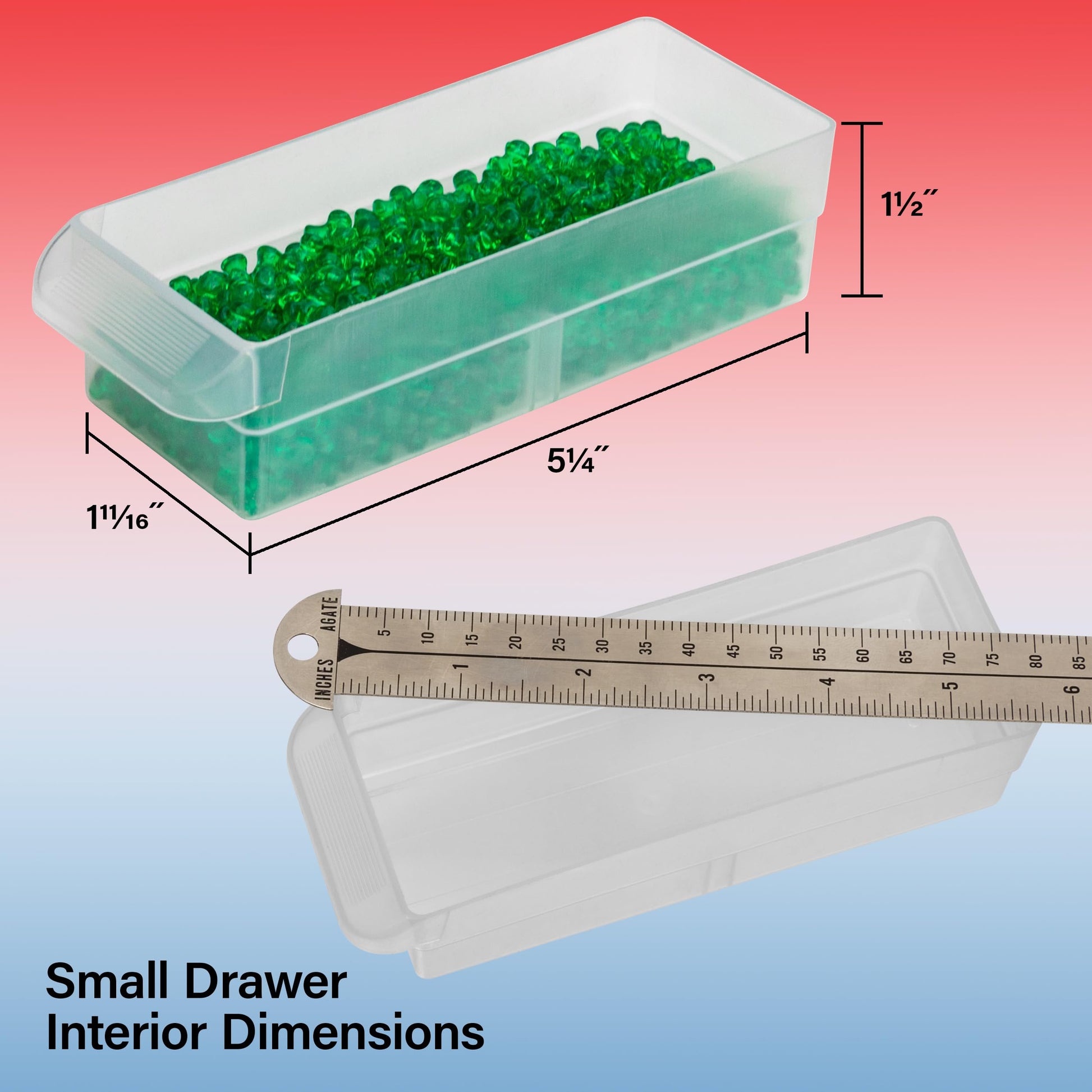 - HEAVY DUTY CABINET WITH 26 DRAWERS: The small storage cabinet is made in the U.S.A. from rugged, high-impact plastic and measures 20" W x 6" D x 10" H; Organizer drawer external dimensions - 6" x 4-9/16" x 2-3/16" (large); 6" x 2-7/32" x 1-9/16" (small)