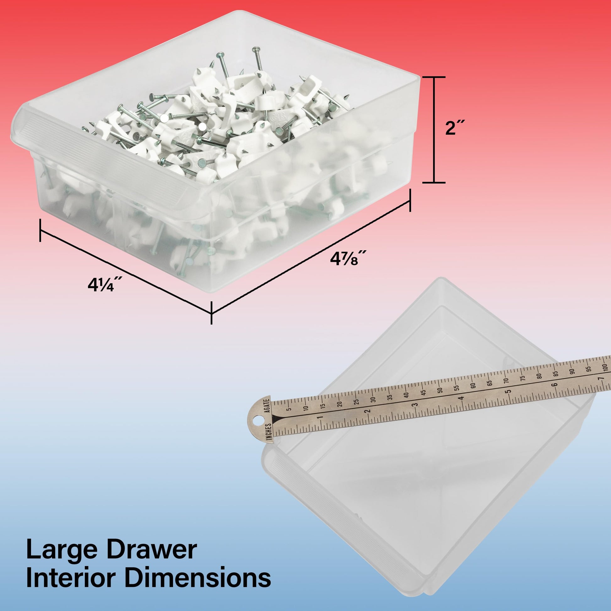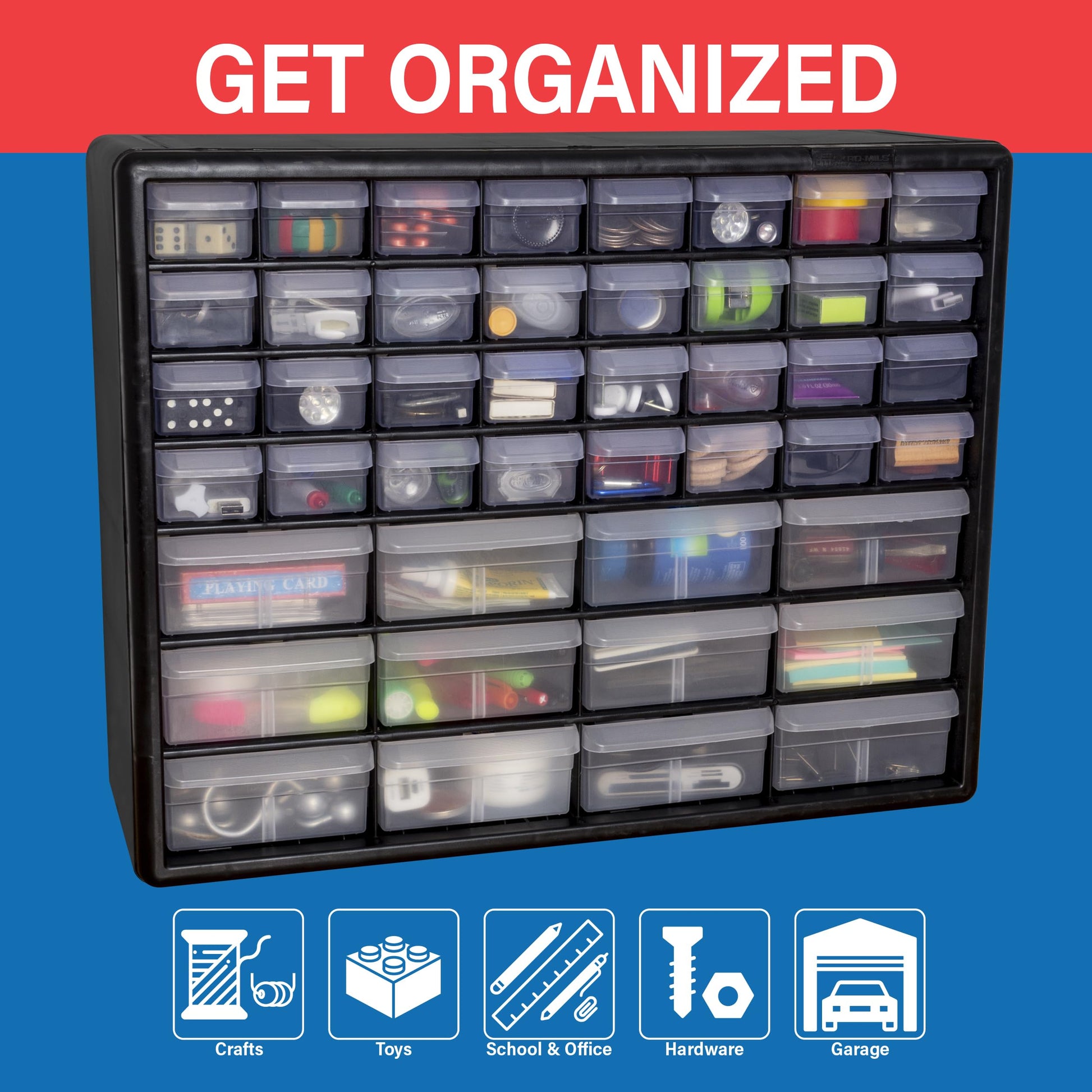Details: The Akro-Mils 10144 44-Drawer Plastic Storage Cabinet Organizer with Drawers is a great solution for all your storage needs. This heavy-duty cabinet is made in the U.S.A. from rugged, high-impact polystyrene plastic and features 44 large and small plastic drawers offering ample storage space for all your small parts and tools. Plastic organizer large drawers inside dimensions: 4-7/8-Inch x 4-1/4-Inch x 2-Inch; small storage drawers inside dimensions: 5-1/4-Inch x 1-11/16-Inch x 1-1/2-Inch. Whether you're looking to organize your garage, workshop, classroom, or home, this storage cabinet has you covered. Garage owners and businesses will love the versatility of this cabinet, with the plastic storage drawers perfect for use as a hardware organizer, screw organizer box, or for battery storage. Keep your nails and other small parts accessible with ease. Teachers can use the cabinet for classroom storage, as a teacher toolbox, art storage, craft storage box, for scrapbook supplies, and more. This plastic storage cabinet is also perfect for home storage and organization. Use it as a lego organizer, craft organizer, hobby organizer, or bead storage organizer. It's even great for makeup storage and organization or for medicine and first aid supplies. And with the ability to stack cabinets securely or wall-mount them using keyhole slots, along with finger-grip drawer pulls and rear stop tabs to prevent contents from spilling, this cabinet has everything you need to keep your items safe and organized. Cabinets have 8 small crosswise dividers and 4 large length dividers included. Included dividers are molded into the back of the cabinet (remove with scissors). Additional dividers can be purchased separately.