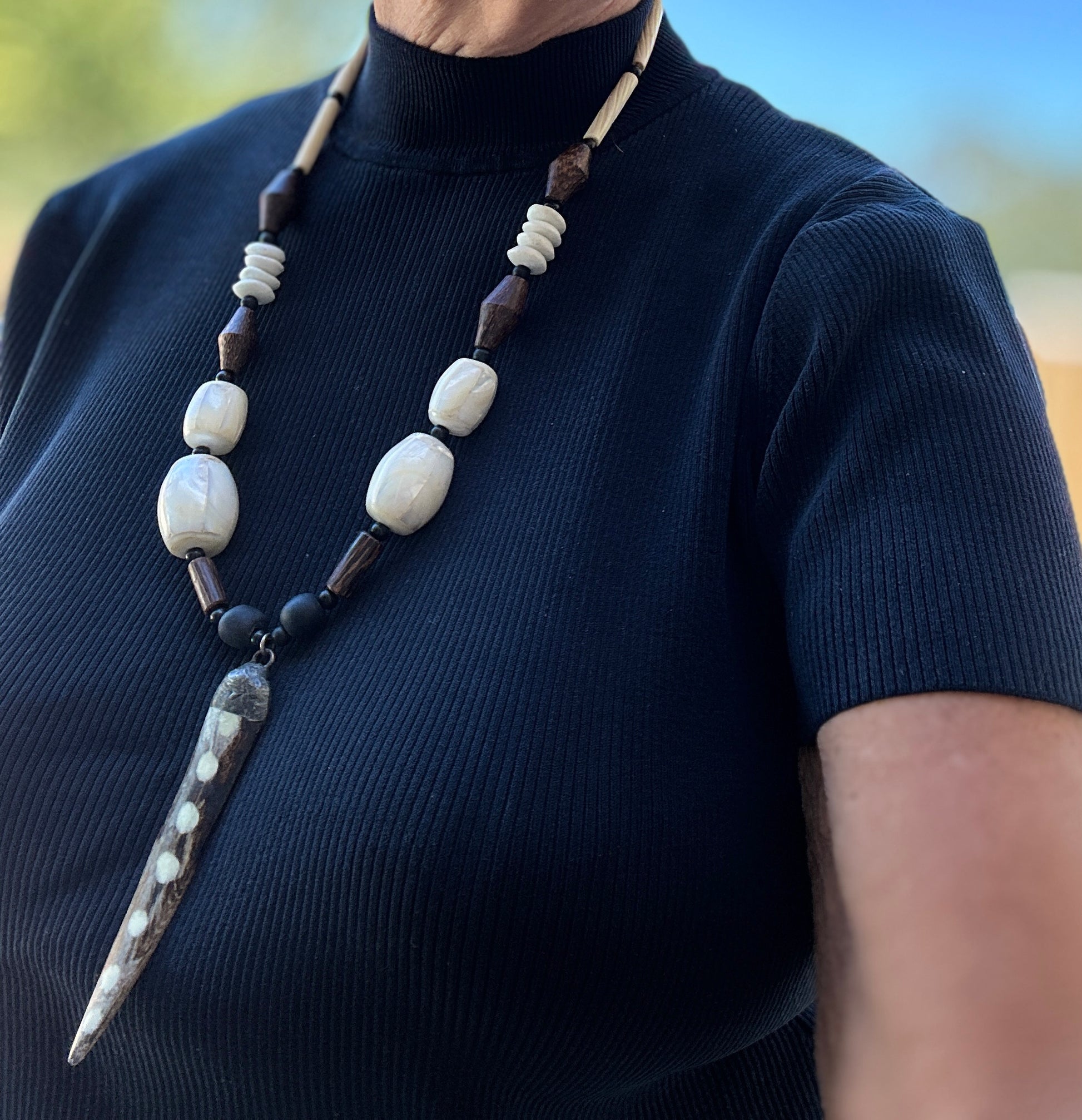 The necklace combines smooth carved discs, geometric patterned beads, and organic textures to create a balanced yet powerful look. Its horn pendant adds movement and drama, making it the perfect finishing touch for both modern and traditional styles.