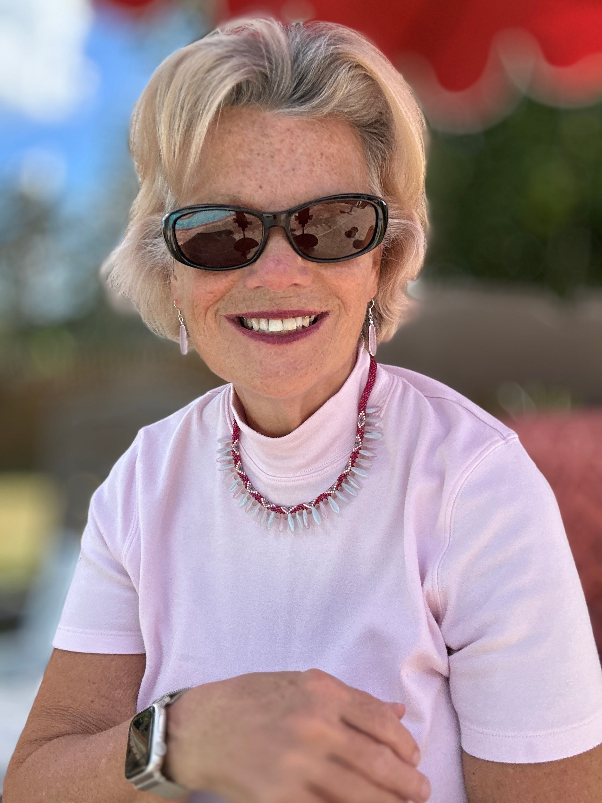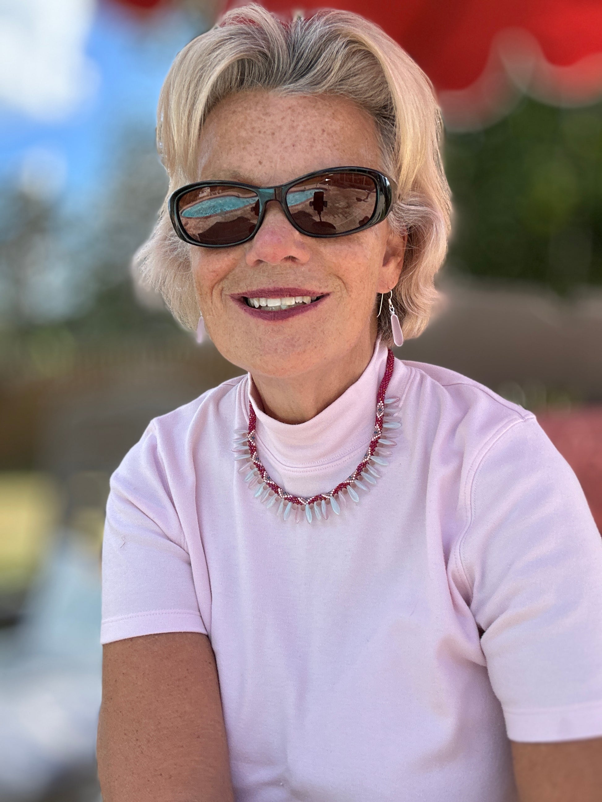 Inlaid with ten pink diamonds, the handmade Marina necklace is crafted using size 11.0 Charlotte round cut beads, crocheted in 6 rounds. It features 30 large opaque pink/blue daggers, with micro-teardrop pink beads crocheted between each dagger. This striking piece is perfect for special occasions or everyday wear.