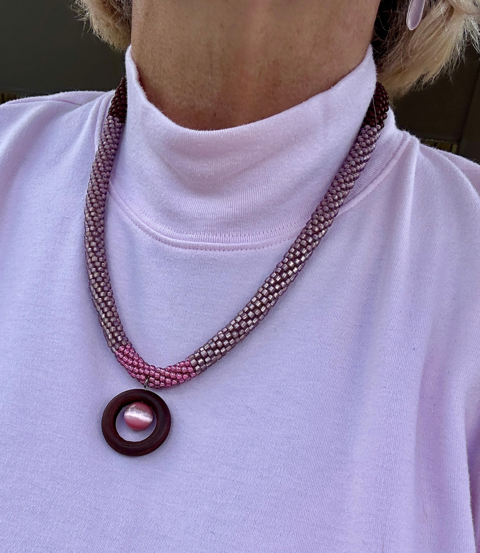 Embrace subtle sophistication with the Rosy Horizon Beaded Necklace, a handcrafted marvel that seamlessly blends delicate shades of pink in a smooth gradient bead crochet design. The necklace culminates in a bold wooden circle pendant encasing a matching pink bead, creating a captivating focal point that balances natural warmth with refined artistry.